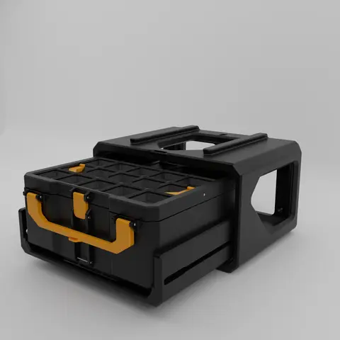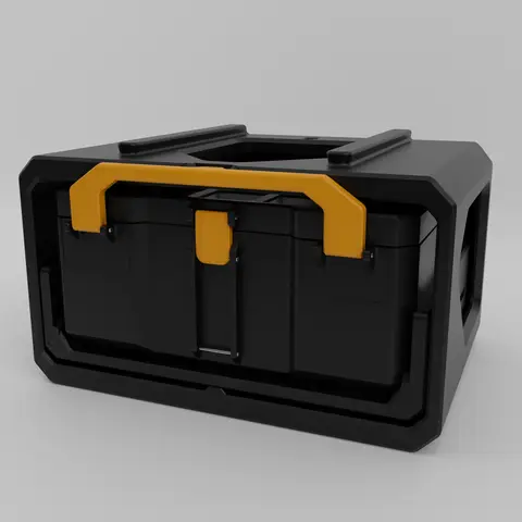 Gridfinity-compatible Pro storage box designed for organised workshop and maker space storage, with one-hand latch access, controlled lid stop, and stack-and-latch expandability.
