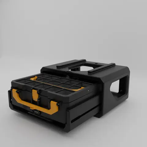 Gridfinity-compatible Pro storage box designed for organised workshop and maker space storage, with one-hand latch access, controlled lid stop, and stack-and-latch expandability.